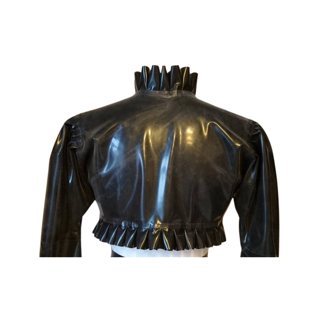 Introducing our Frill Trim Bolero Jacket! Made from 0.4 mm thickness latex, this jacket features rounded sides and a frill colour of your choice on the neckline, hem, and long sleeve cuffs.