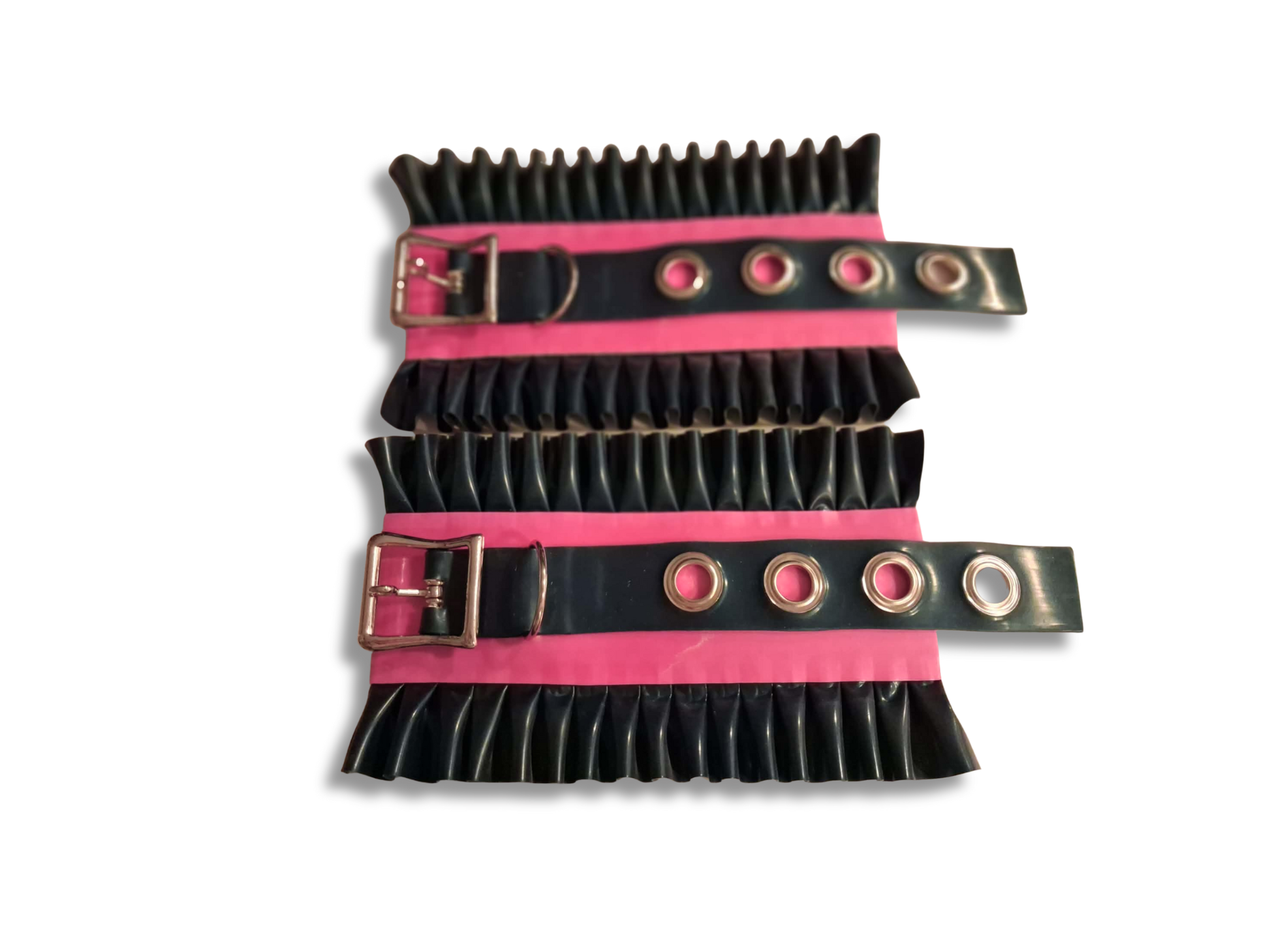 Get ready to add some frills to your play with our Frilled Latex Cuffs! These versatile cuffs can be used on wrists or ankles and feature a contrast frill trim for a touch of fun. With a secure buckle fastening and made from high-quality 0.4mm latex, these cuffs are both stylish and durable. Handmade and playful, these cuffs are perfect for any kinky adventurer. (Latex levels: 0.4mm thickness and 1mm straps)