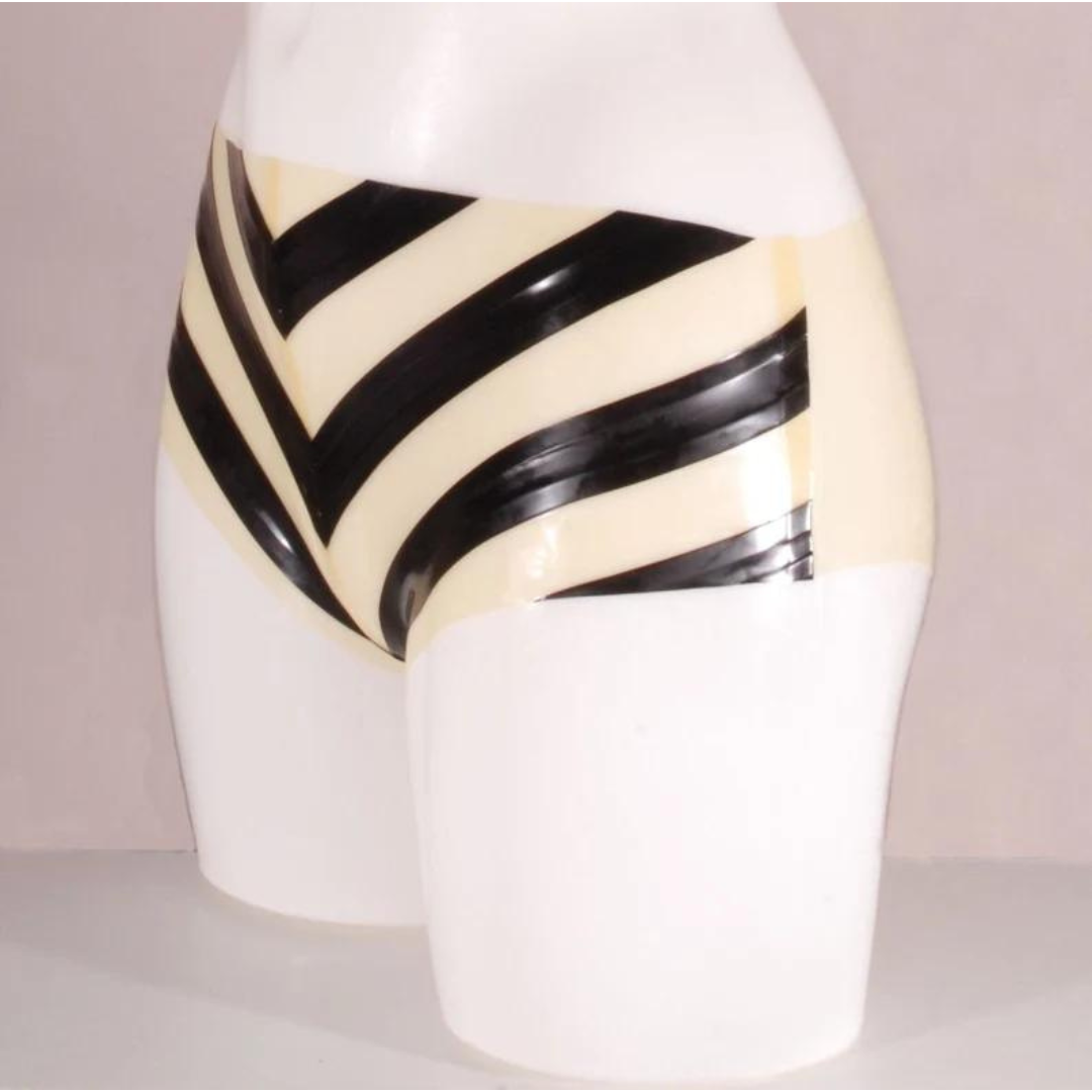 Add some sass to your lingerie collection with these handcrafted latex knickers in a playful chevron pattern. Made from high quality 0.4 mm latex, these high rise knickers offer a cheeky see-through option in addition to a variety of colours.