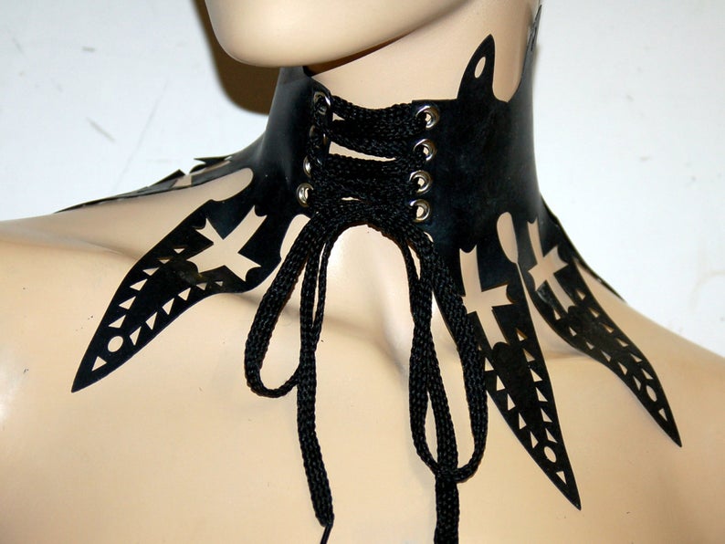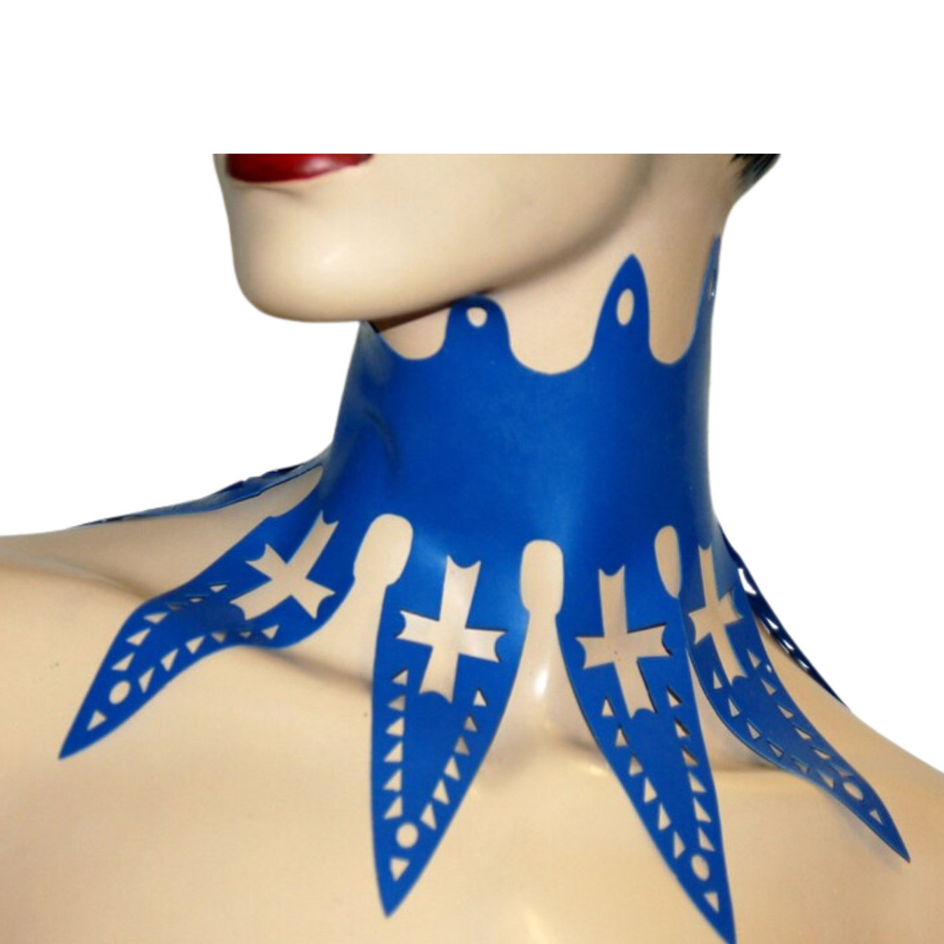 Unleash your inner goth with our Latex Gothic Choker. Made with our unique laser cut cross pattern, this 0.4 mm latex lace collar has high neckline and is finished with 4 sets of eyelets. Perfect for completing an outfit or as a first foray into latex. Fully reinforced seams for lasting wear.