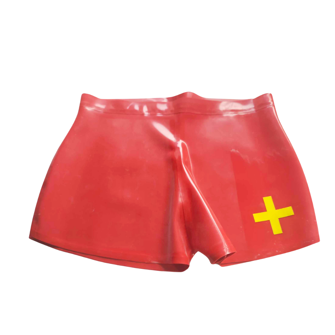 Stay safe and stylish in our Latex Lifeguard Outfit! Made of 0.4 mm thick latex, this bright red sleeveless top and shorts set features bold yellow text and cross details.