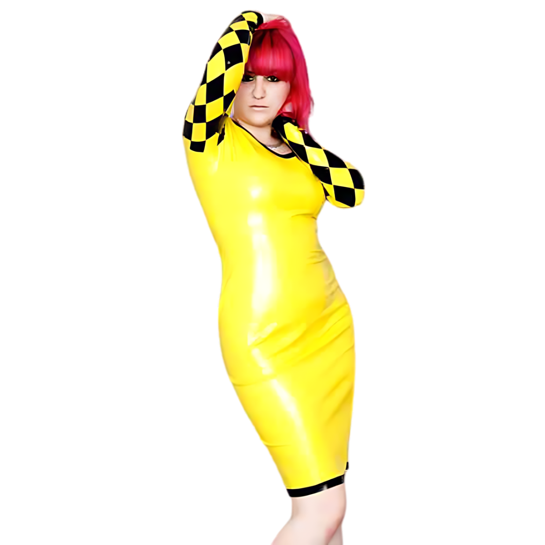 This handmade latex racer dress will zip you into a sleek, knee-length pencil dress with diamond panel sleeves. With a thickness of 0.4 mm, this dress will hug your curves and turn heads all night long.