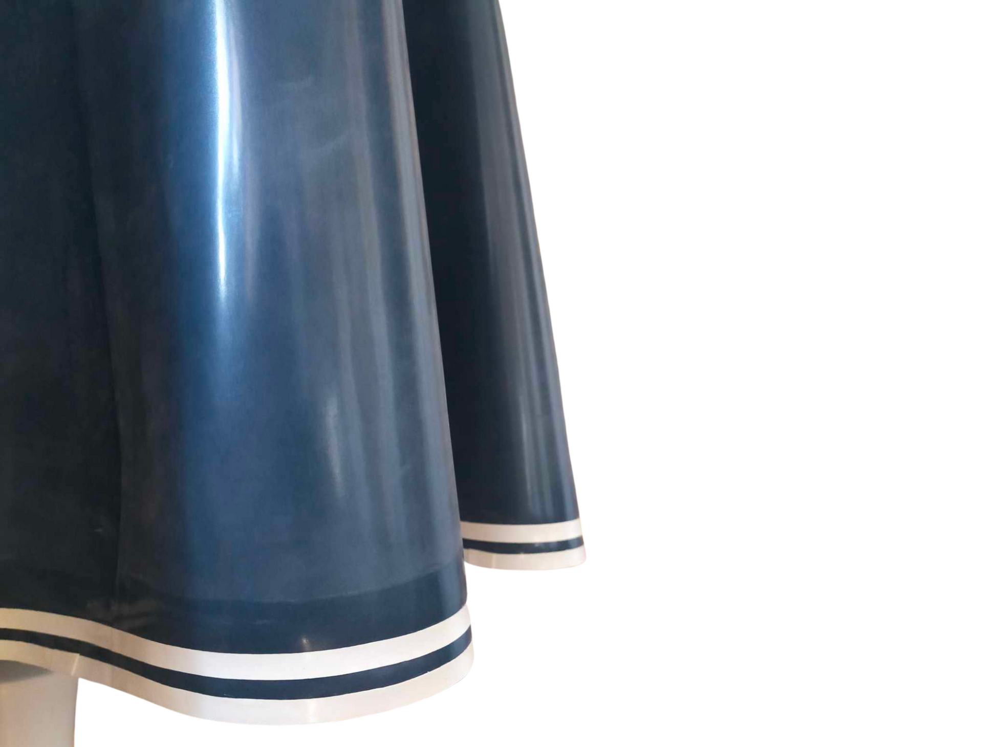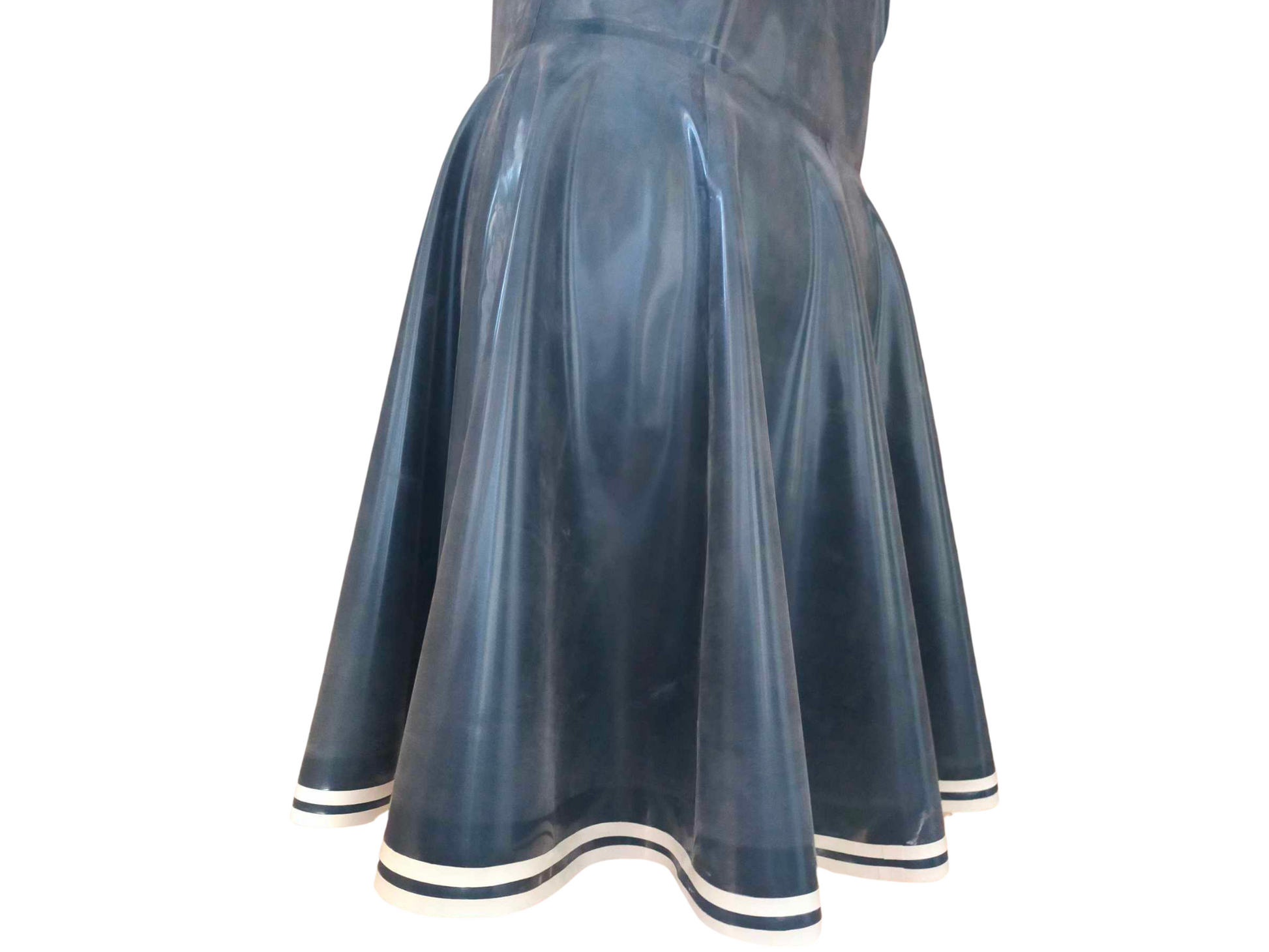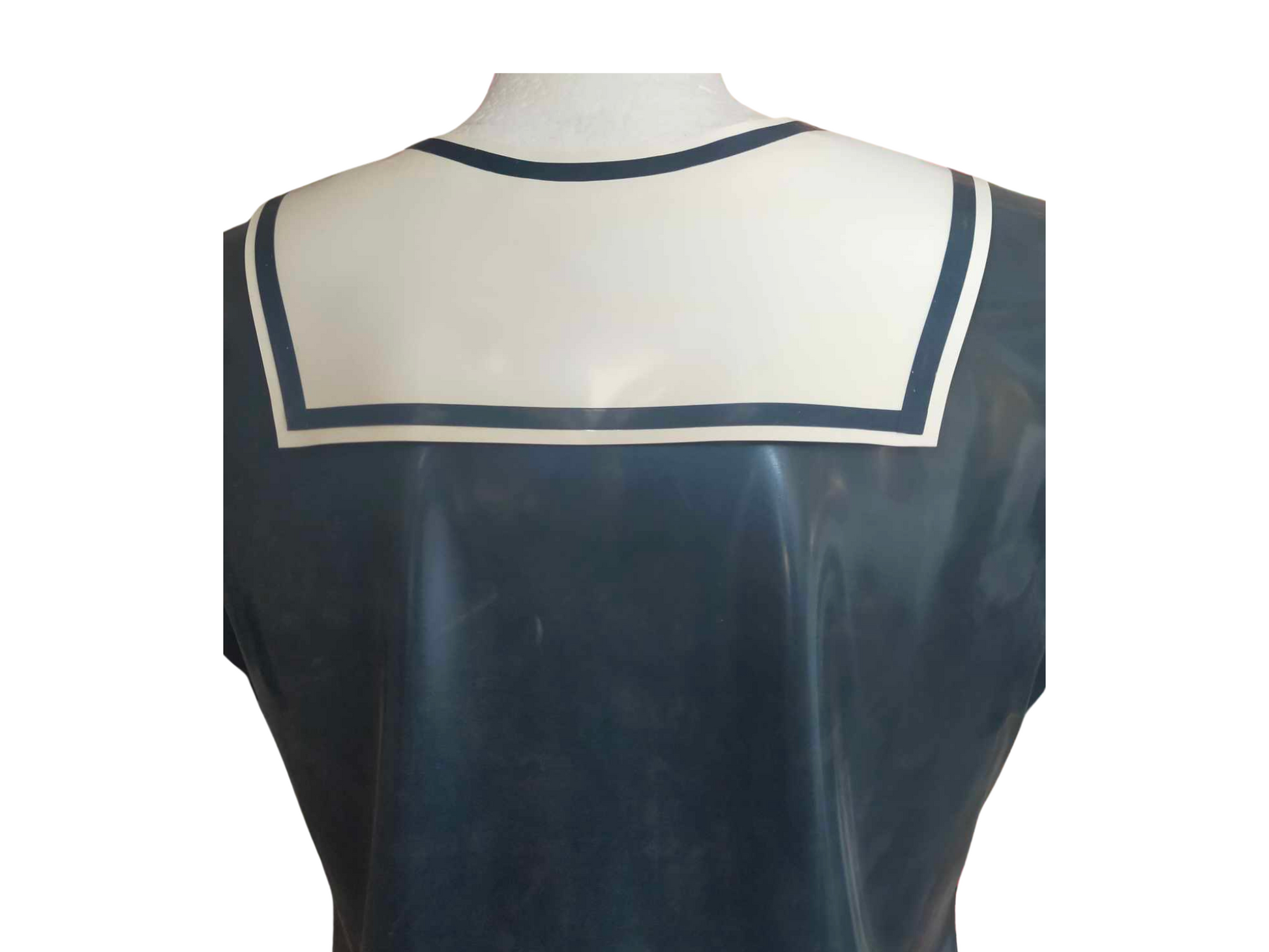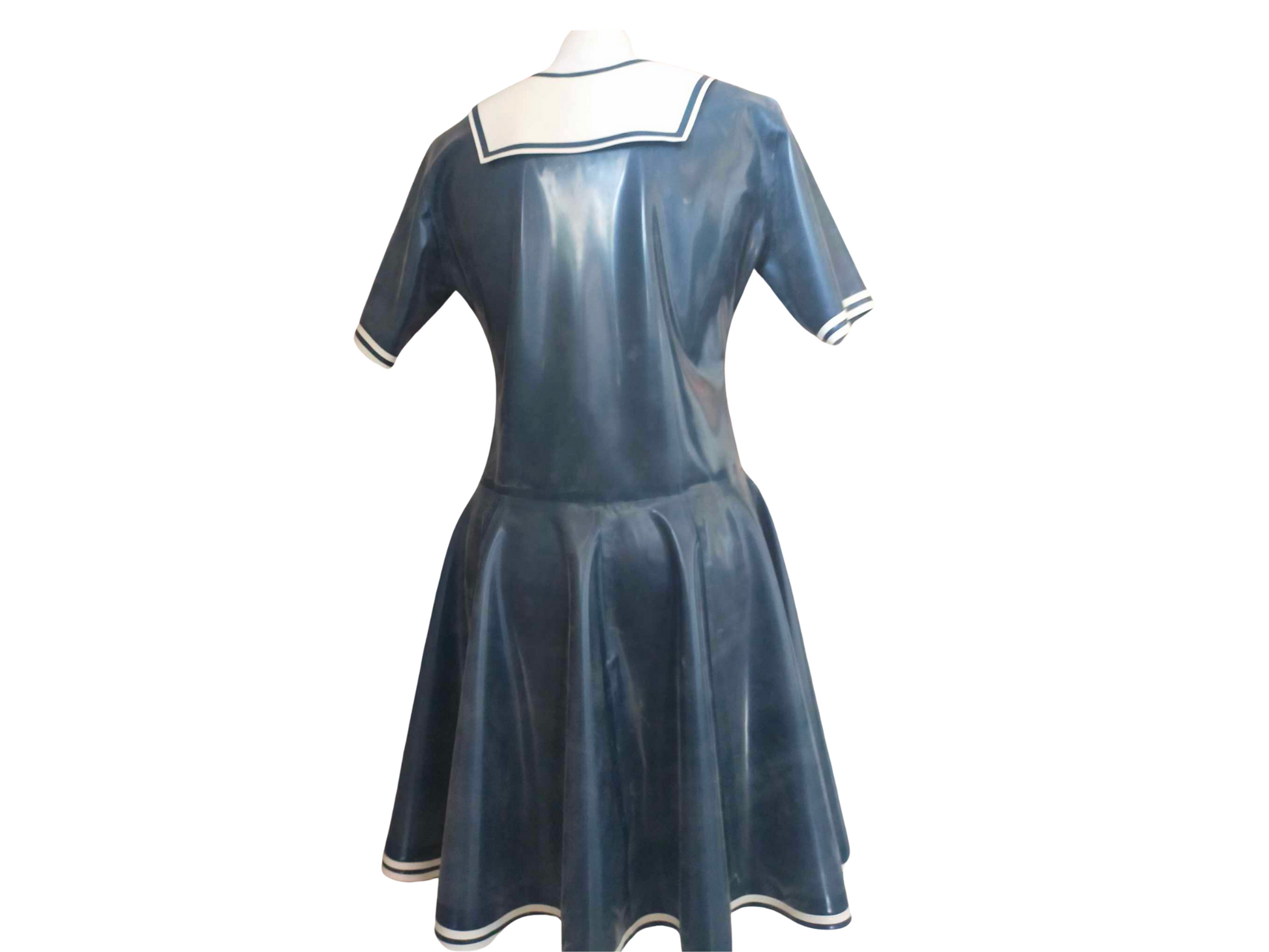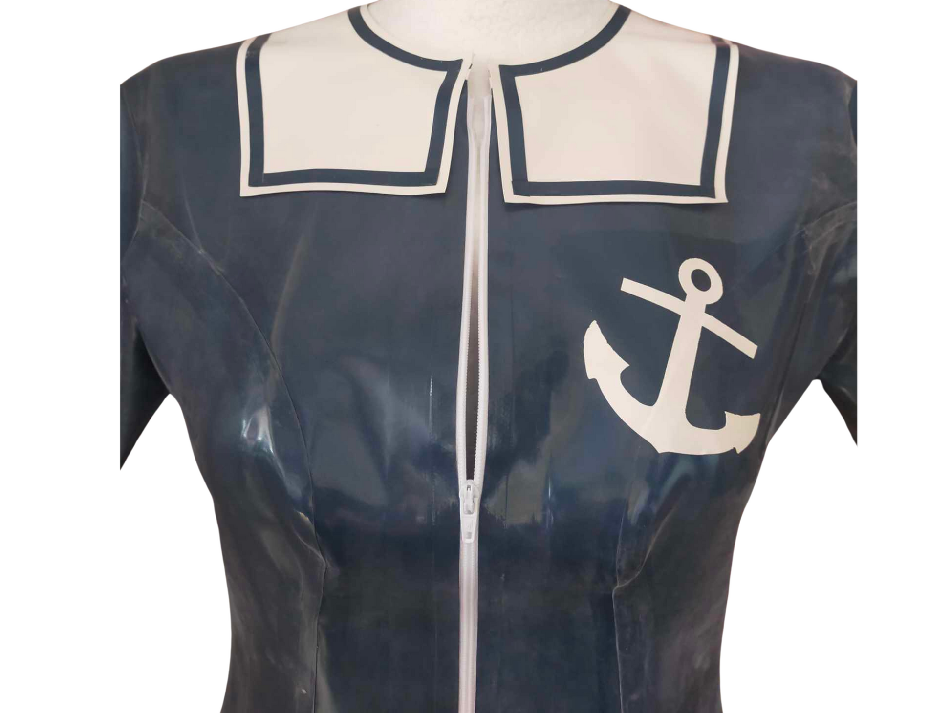 Sailor-inspired style meets edgy latex with our Latex Sailor Dress! Zip up the front and set sail in this playful, short-sleeved dress. The double row of white trim, anchor applique, and nautical collar add a touch of whimsy. Made from 0.4mm thick latex for a unique twist on a classic look.
