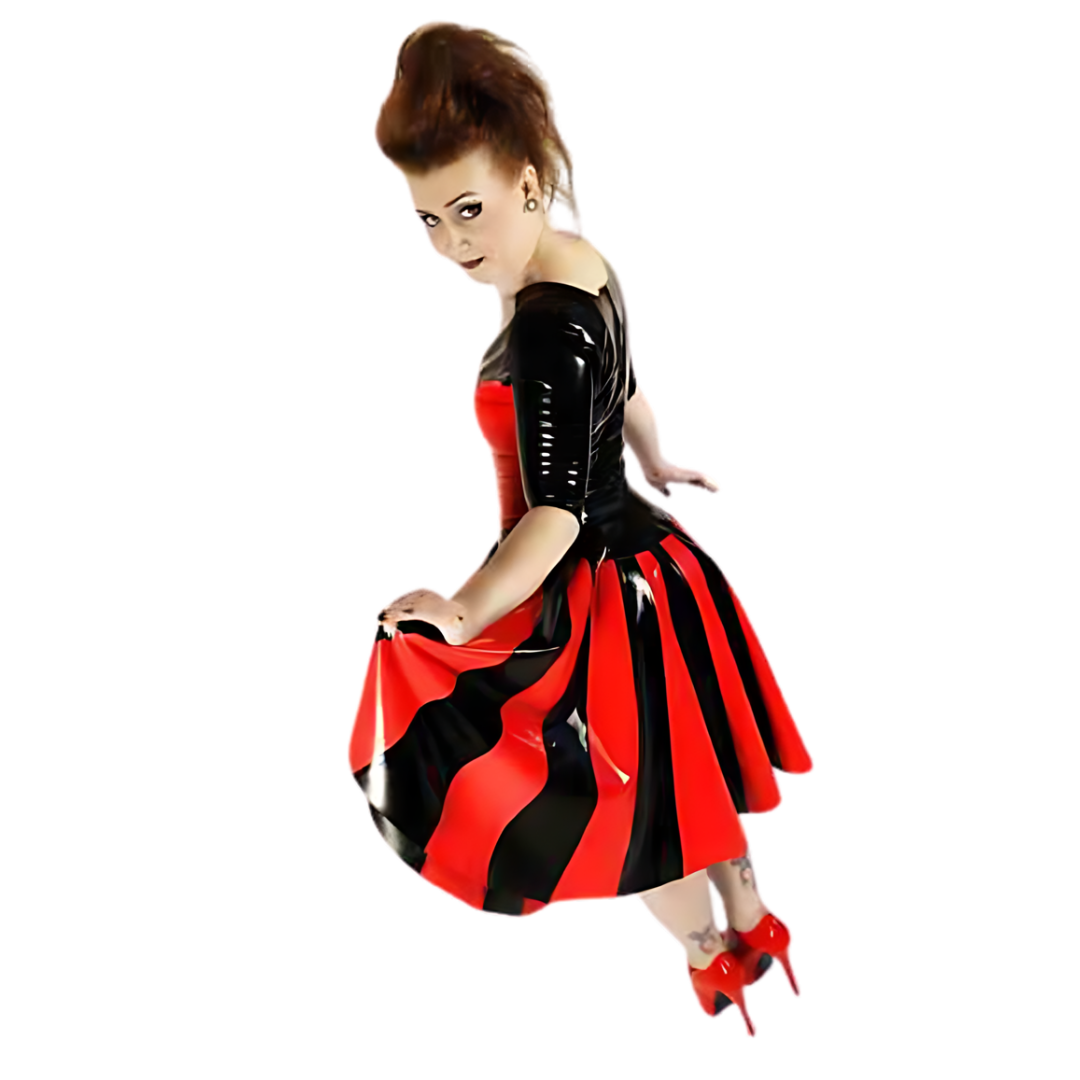 Bring some playful flair to your wardrobe with our handmade Latex Sunray Dress! Featuring a fit and flare design with sunray stripes and contrast side panels, this dress is both stylish and unique. Made with 0.4 mm thick latex, it's sure to turn heads.