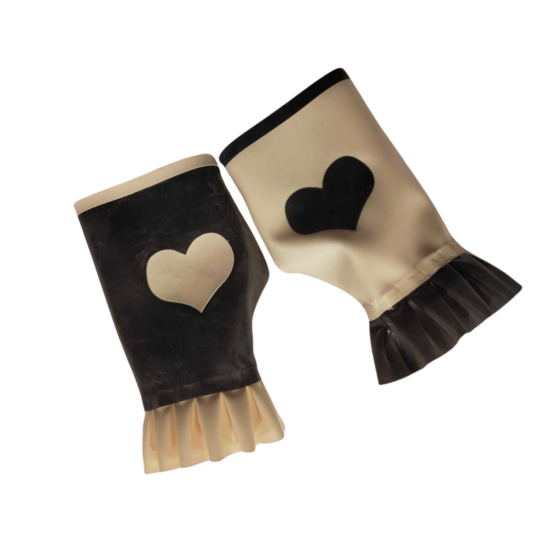 Add a playful touch to your outfit with these Monochrome Hearts Latex Gloves. The fingerless design and frill cuff allow for easy movement, while the heart on the back adds a quirky detail. Available in black with a white heart or red with a black heart (a reverse colour option).