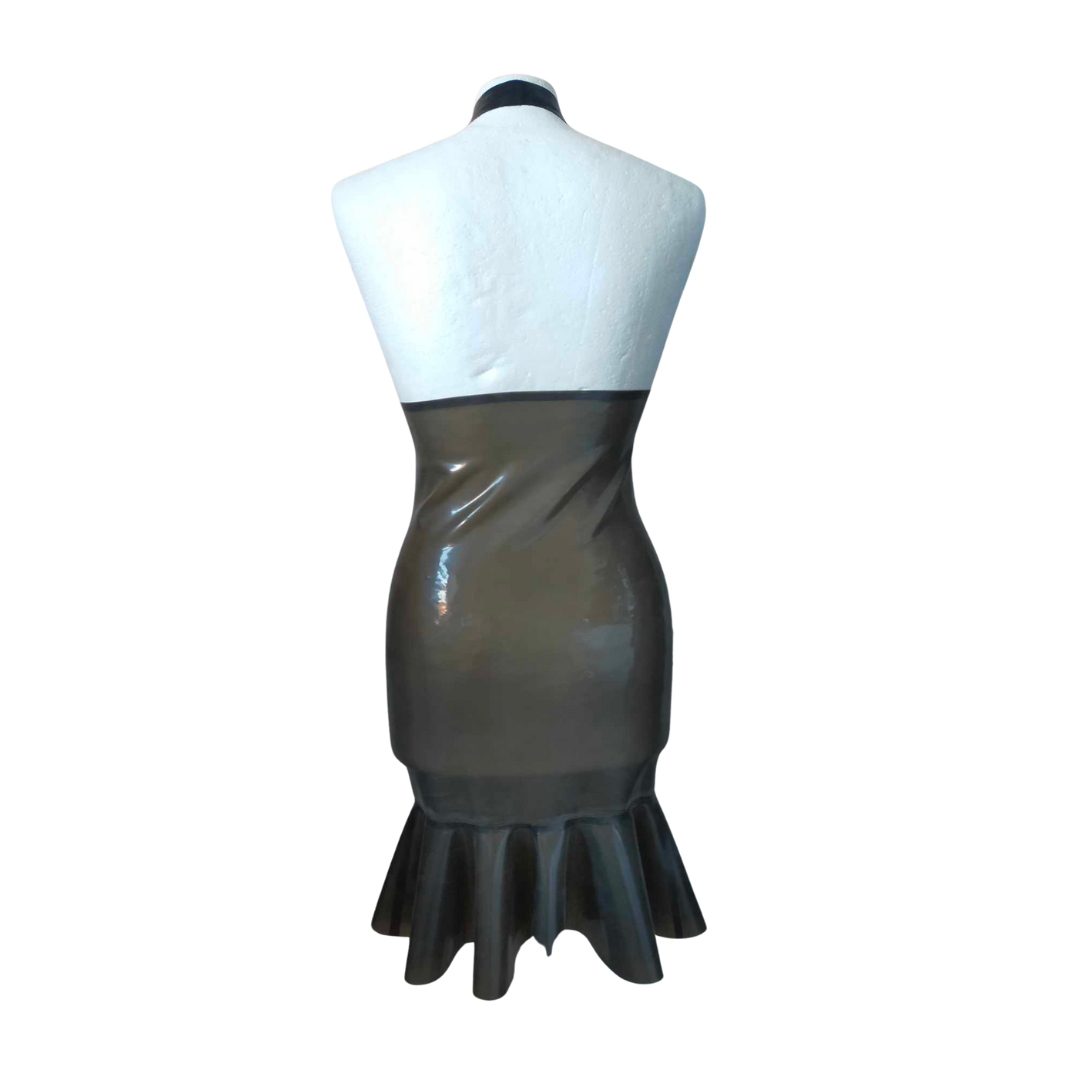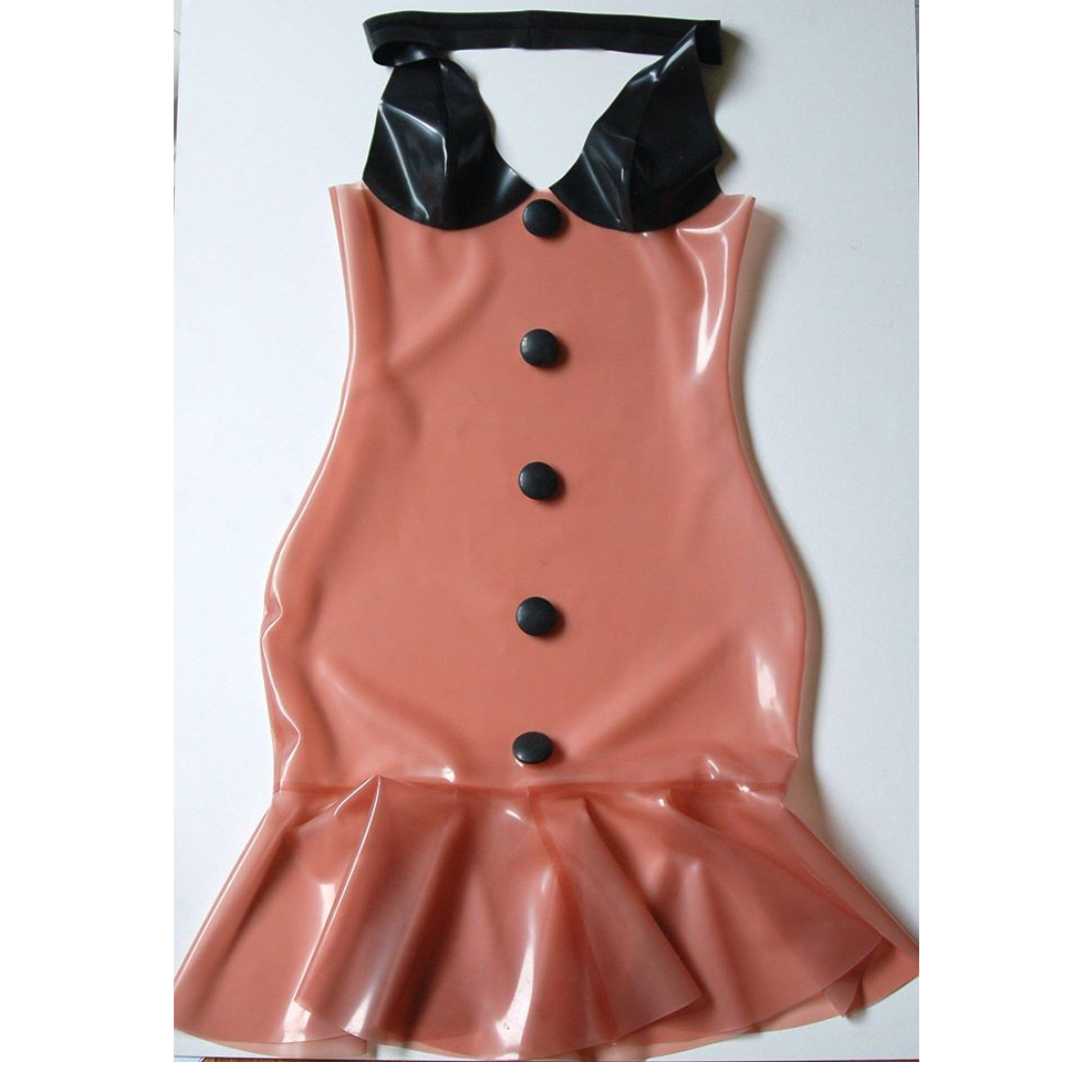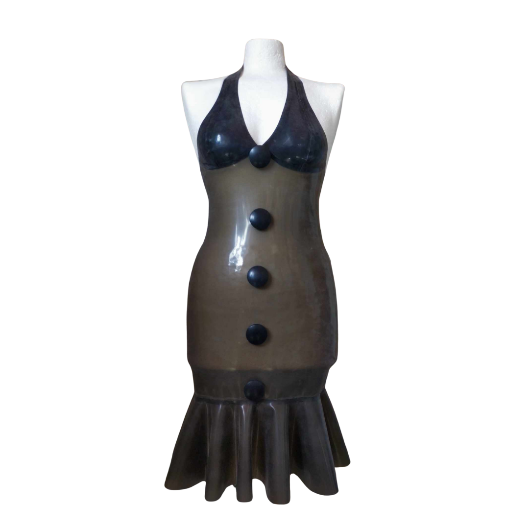 Get ready to turn heads with our Translucent Latex Halter Neck Button Dress! Made with a durable 0.4 mm thickness, this dress features rubber covered buttons and a pin up style. The halter neck and black cups add a bold touch to this unique and playful piece.